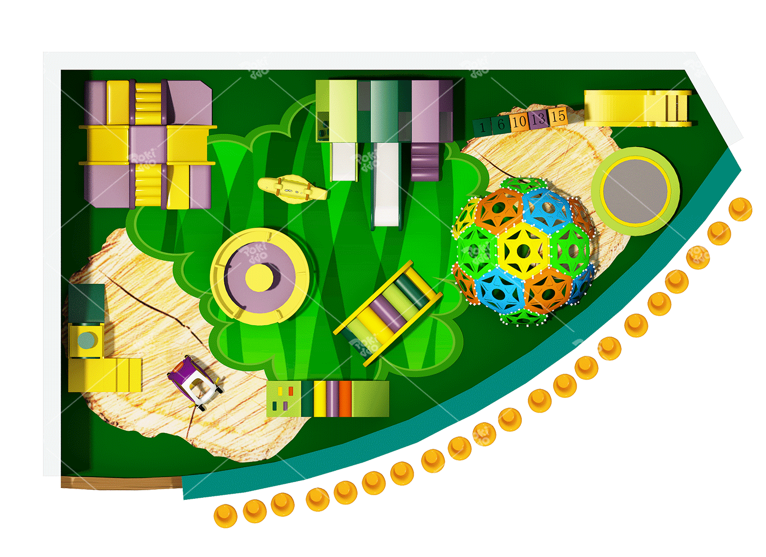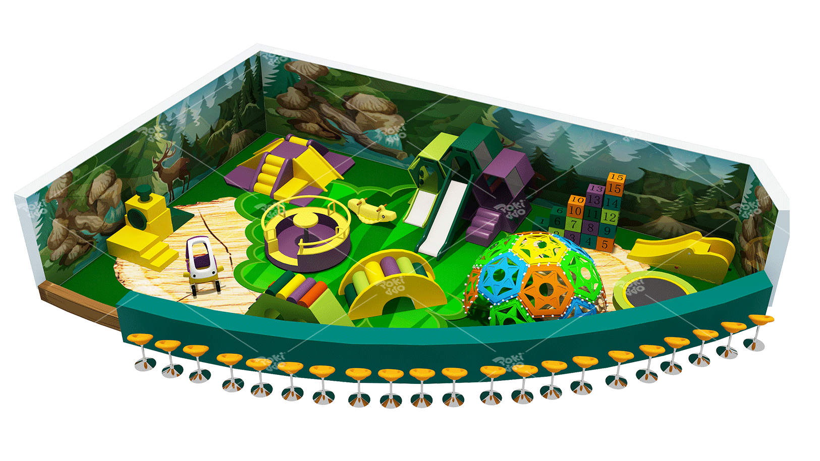 (4)Immersive Details: Cedar forest murals adorn walls; “soundscape buttons” play birdcalls/wind in cedar groves; “tree stump walkways” (15cm EVA logs, 20cm apart) hone balance.